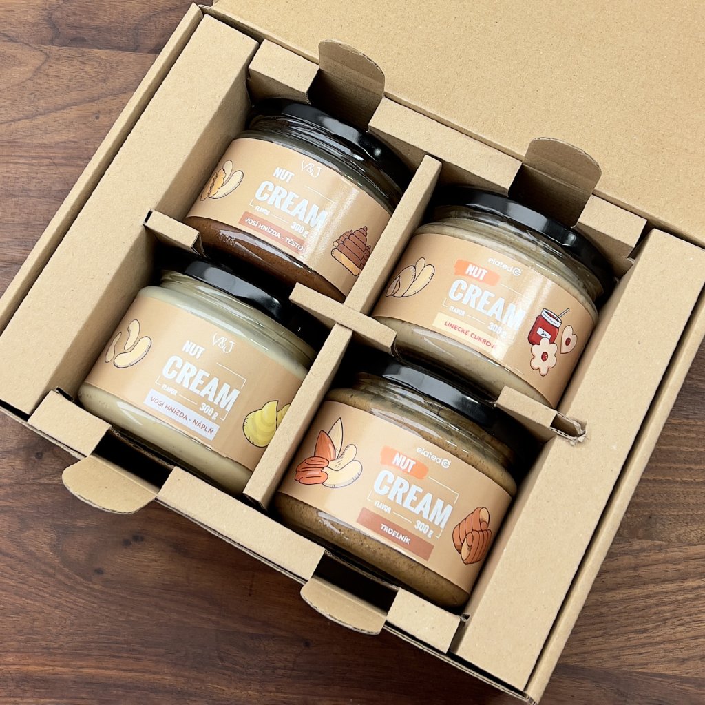 V boxu objevíš čtyři 300gramové sklenice ořechového potěšení: Vosí hnízda (těsto + náplň), Linecké cukroví & Trdelník. Každé jiné, každé vyladěné k dokonalosti. A dvě z nich si dokonce můžeš chuťově přizpůsobit! Tak to tak vypadá, že letos nemusíš péct cukroví, protože si perfektně vystačíš s našimi másly. Jsi ready na výživnější, ještě chutnější Vánoce?